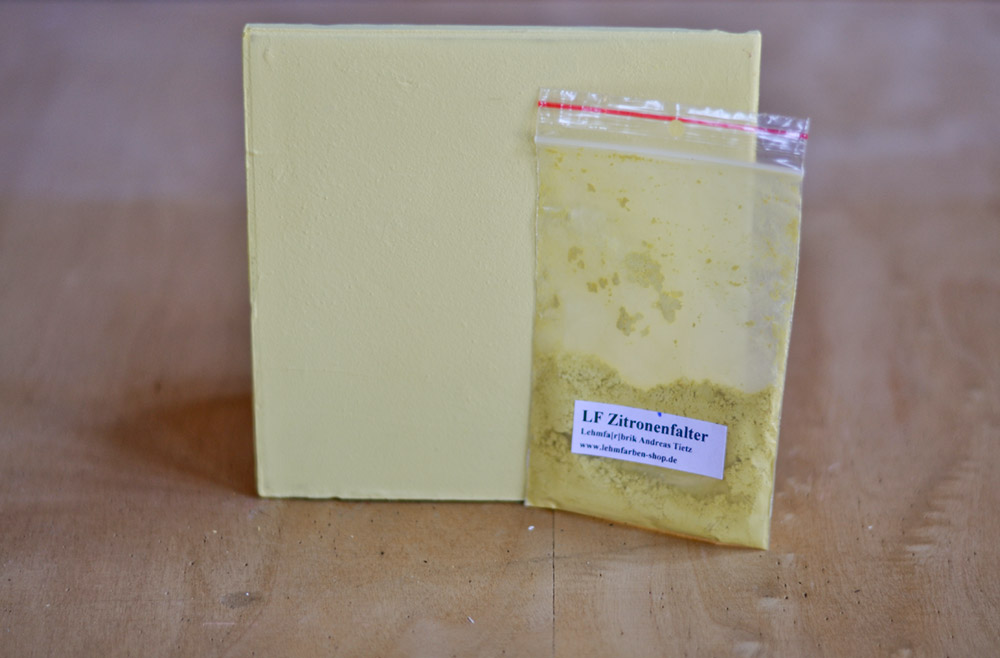Sie erhalten unsere Lehmfarbe "Zitronenfalter" für samtrauhe Oberflächen in Pulverform.